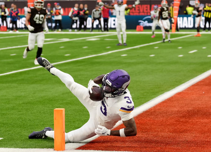 In piena redzone, no-Huddle, Carson Wentz prende il pallone dallo snap, alza lo sguardo verso destra e lancia il pallone mirando il “pylon”, salto felino di Jordan Addison che riceve il pallone e atterra in Endzone, Touchdown per la vittoria.