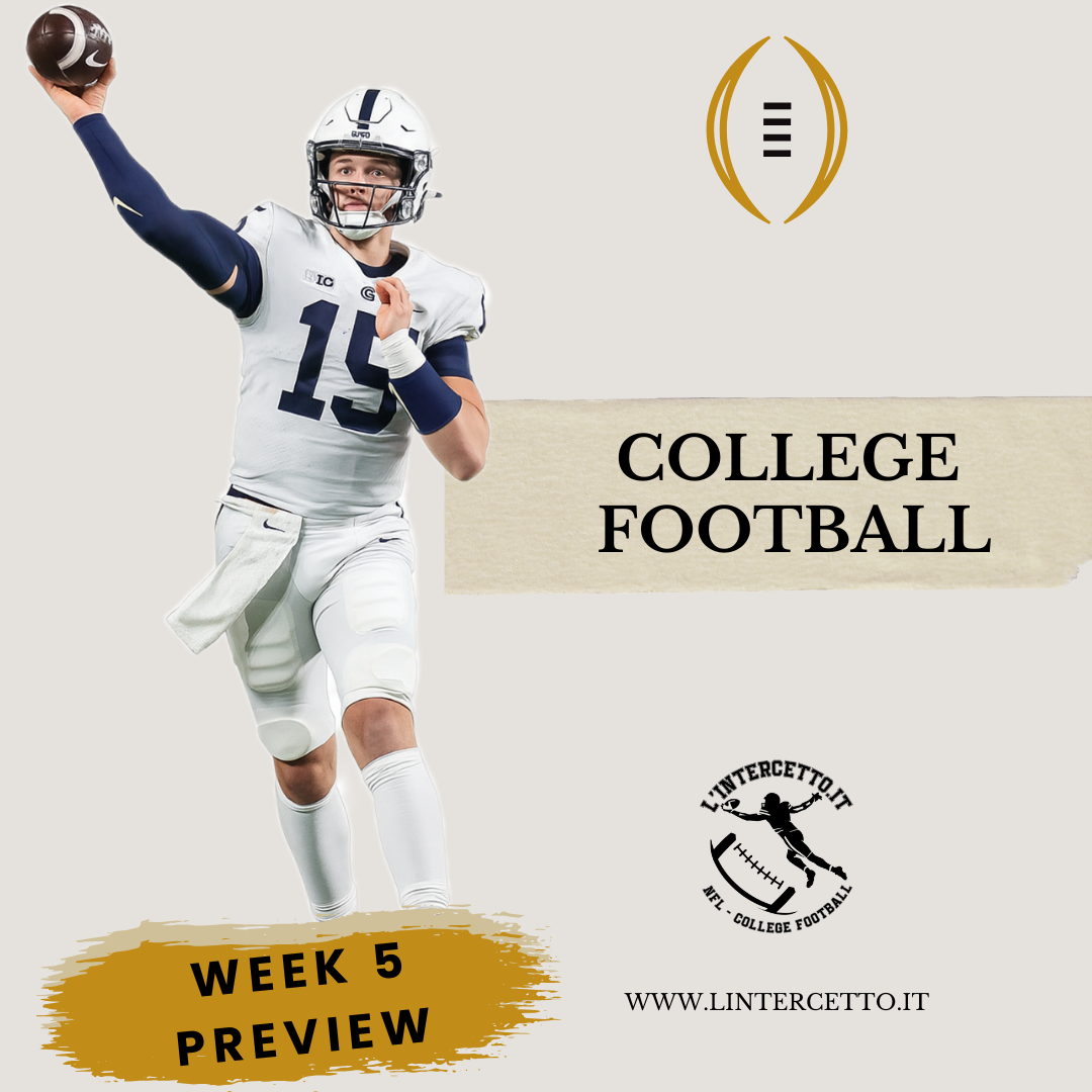 Dopo una week 4 che ha regalato molte conferme, interrotto i cammini trionfali di alcune squadre che speravano in una possibile apparizione ai playoff e di fatto cancellato tutte le speranze playoff di altre, continua il cammino di regular season del College Football, con una Week 5 che offre un ricco menù di partite tra cui scegliere.
