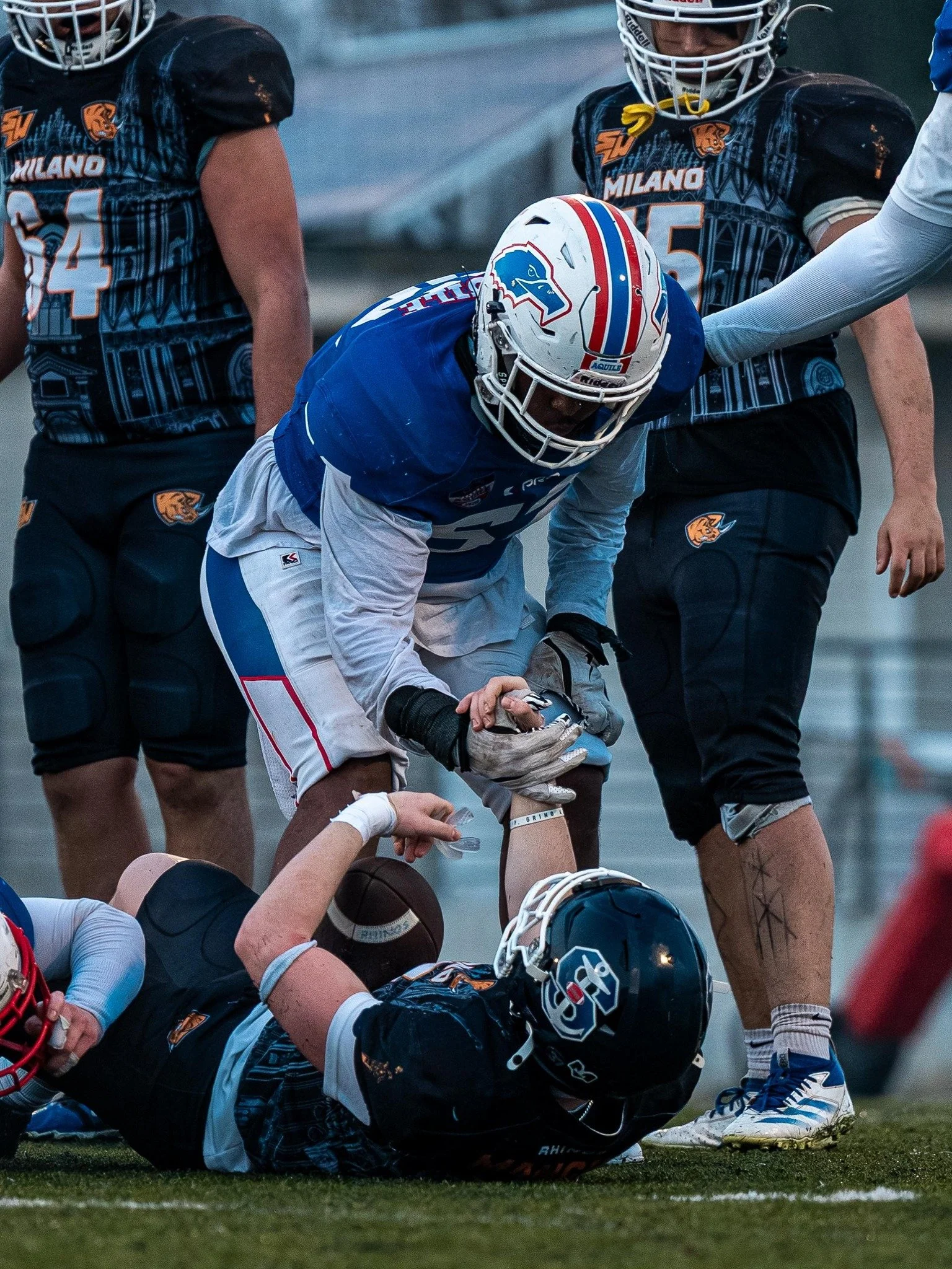 Sarò onesto: alla vigilia pensavo di vedere una partita a senso unico a favore delle Aquile Ferrara, invece è stata una finale molto equilibrata, caratterizzata da numerosi turnover e dove a farla da padrone è stato il gioco via terra. Nonostante i numerosi cambi di possesso palla, però, nessuna delle due formazioni è riuscita ad approfittarne per mettere punti sul tabellone, in parte anche merito delle difese. Come nella finale dello scorso anno, anche in questa edizione la partita è stata di fatto decisa da un fumble recuperato nella endzone avversaria, l'unica differenza è che questa volta sono state le Aquile ad approfittarne e non i loro avversari. Prova molto interessante del QB ferrarese Buriani, che ha giocato una buona partita: alternando lanci ben calibrati ad azioni personali di corsa, ha dimostrato di essere un potenziale quarterback dual threat. Secondo il mio parere se iniziasse a giocare oggi in IFL non sfigurerebbe affatto. Titolo di MVP meritato per il RB ferrarese Filippo Franco, che ha corso la maggior parte delle yard via terra dell'offense estense e che ha segnato l'unico TD dell'attacco. Lato Rhinos Milano, il quarterback Delfino ha passato poco il pallone, avvalendosi invece delle corse dei RB, in particolare di Mancini, unico giocatore milanese che è riuscito a mettere a segno dei punti. La maggior parte delle loro giocate offensive è avvenuta grazie all'ausilio della wishbone formation: uno schieramento utilizzato prevalentemente per il gioco su corsa. A mio avviso, ambo le formazioni dovranno lavorare molto per migliorare il gioco di passaggi, grande assente di questa finale, come testimonia il fatto che i ricevitori delle finaliste sono stati chiamati in causa poche volte.