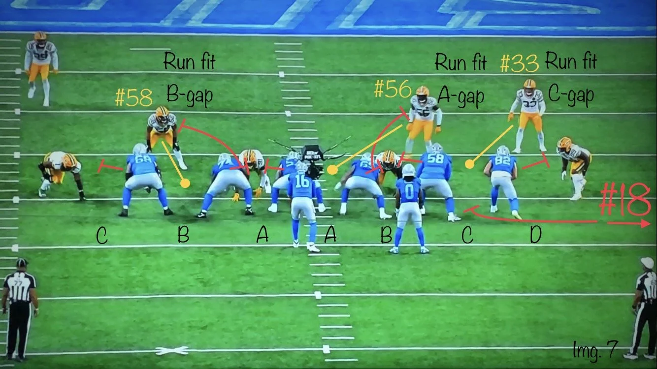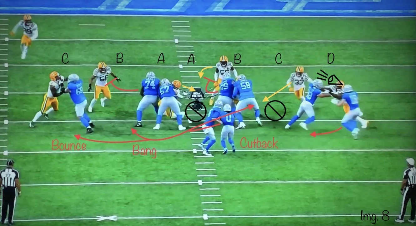 Per ristabilire l’equilibrio numerico, quindi, oltre ai 5 “OL” ed il “TE”, l’attacco deve necessariamente contare anche sui blocchi del “Wide Receiver” (WR) I. TeSlaa (#18). Quest’ultimo, in particolare dovrebbe occuparsene della “S” in modo da tenere pulito il “C-gap” sul lato forte (lato del “TE”) permettendo a Gibbs di eseguire eventualmente il cosiddetto “Cutback”. [Immagine 8 sotto]