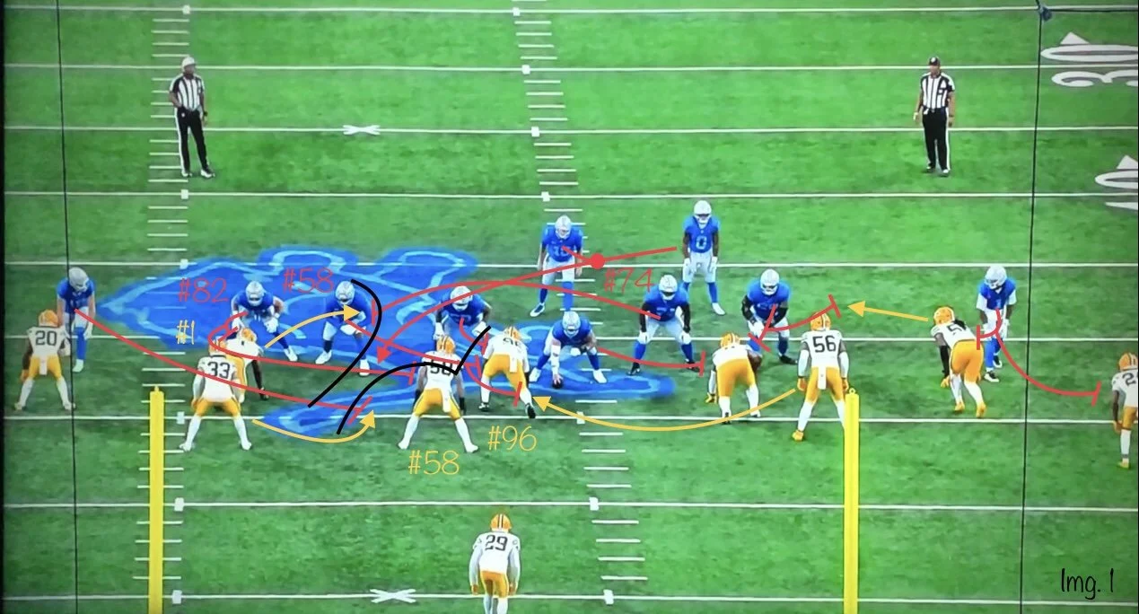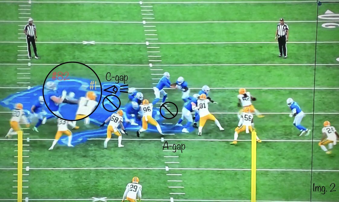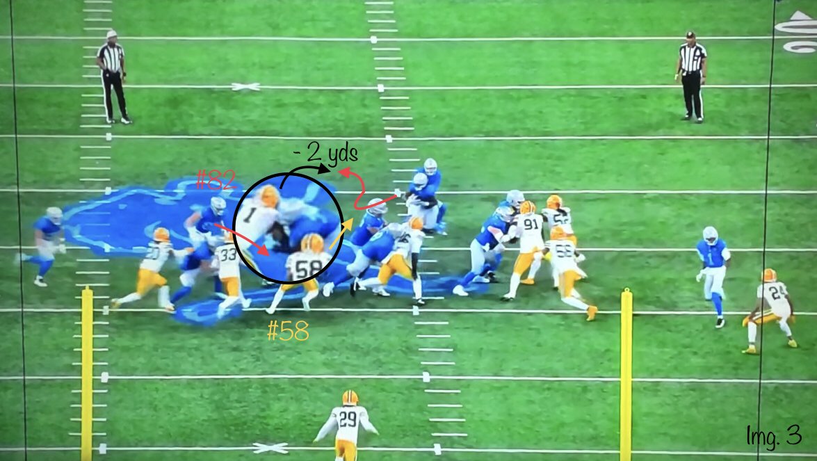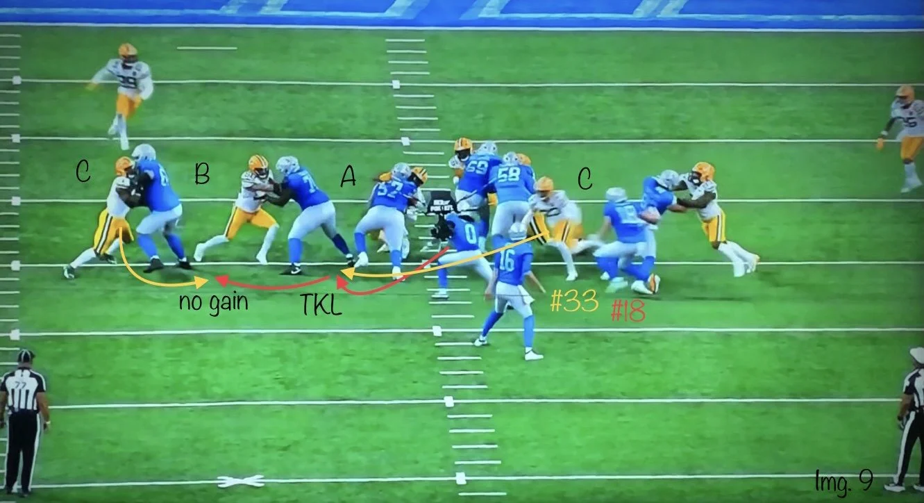 TeSlaa (#18), schierato largo a destra a quasi 5 yds da Dwelley, sembra non aver concluso in tempo il movimento di avvicinamento al “box” nella fase pre-snap; partendo quindi in leggero ritardo rispetto a Williams (#33), gli permette di penetrare nel “C-gap” e di eliminare la possibilità di “Cutback” di Gibbs, costringendolo a deviare la propria traiettoria verso il lato debole. [Immagine 9 sotto]