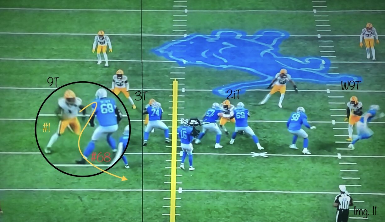 Questa situazione dovrebbe favorire “l’uno contro uno” sia del “DT” ma soprattutto di Parsons (#1) contro Decker (#68), con il “double team” sul lato opposto nei confronti del “DT” in “2iT”. [Immagine 11 sotto]