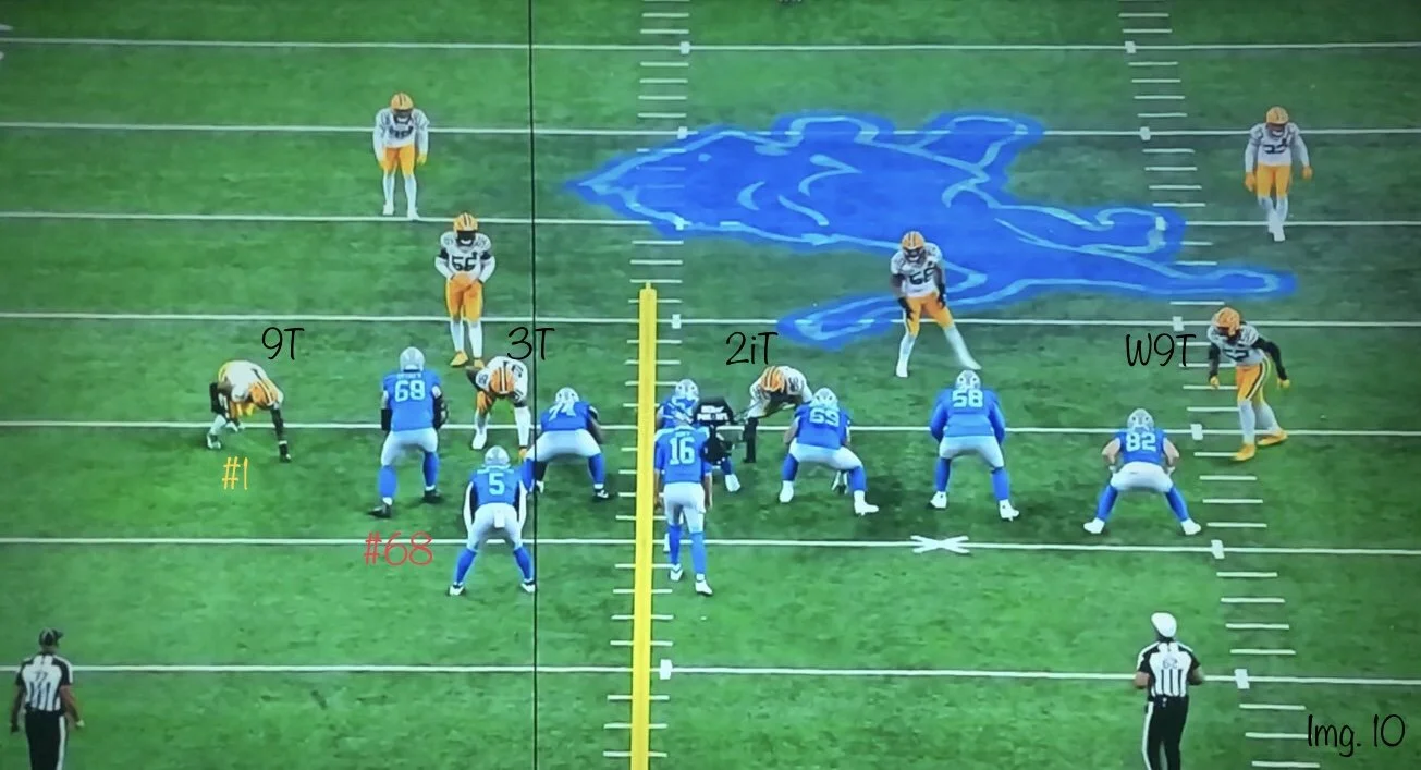 All’inizio del drive dunque, Parsons viene schierato in “Nine Technique (9T)” sul lato opposto rispetto al “TE”. Inoltre, sullo stesso lato viene collocato anche il “DT” in “3T” (allineamento sulla spalla esterna dell’ “OG”), dando luogo al cosiddetto “Under Front”. [Immagine 10 sotto]