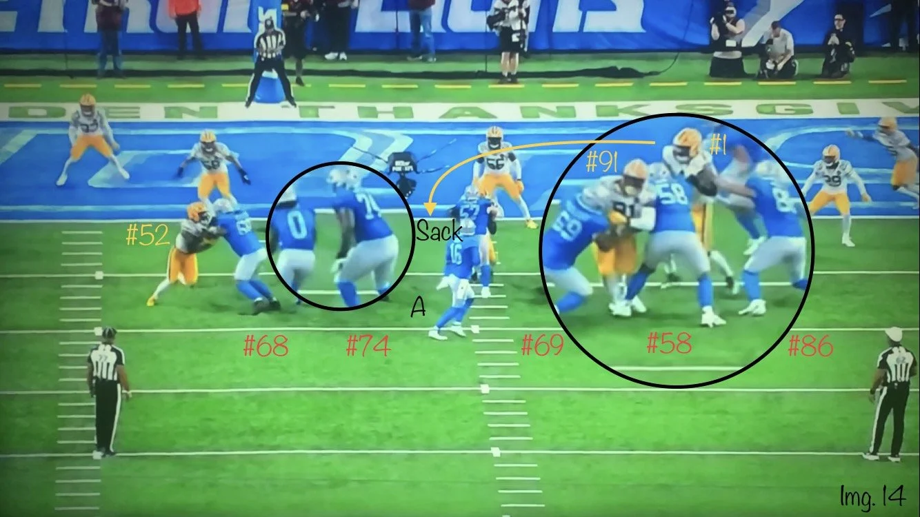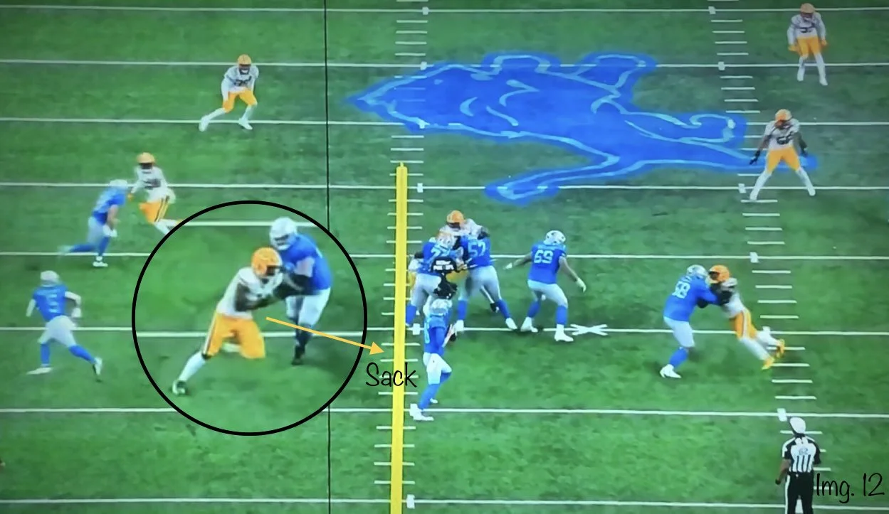 L’apparente movimento iniziale verso l’interno e il cambio di direzione successivo verso l’esterno mettono “fuori gioco” il “LT” Decker (#68), consentendo a Parsons di arrivare indisturbato dal “lato cieco” e mettere a terra Goff. [Immagine 12 sotto]