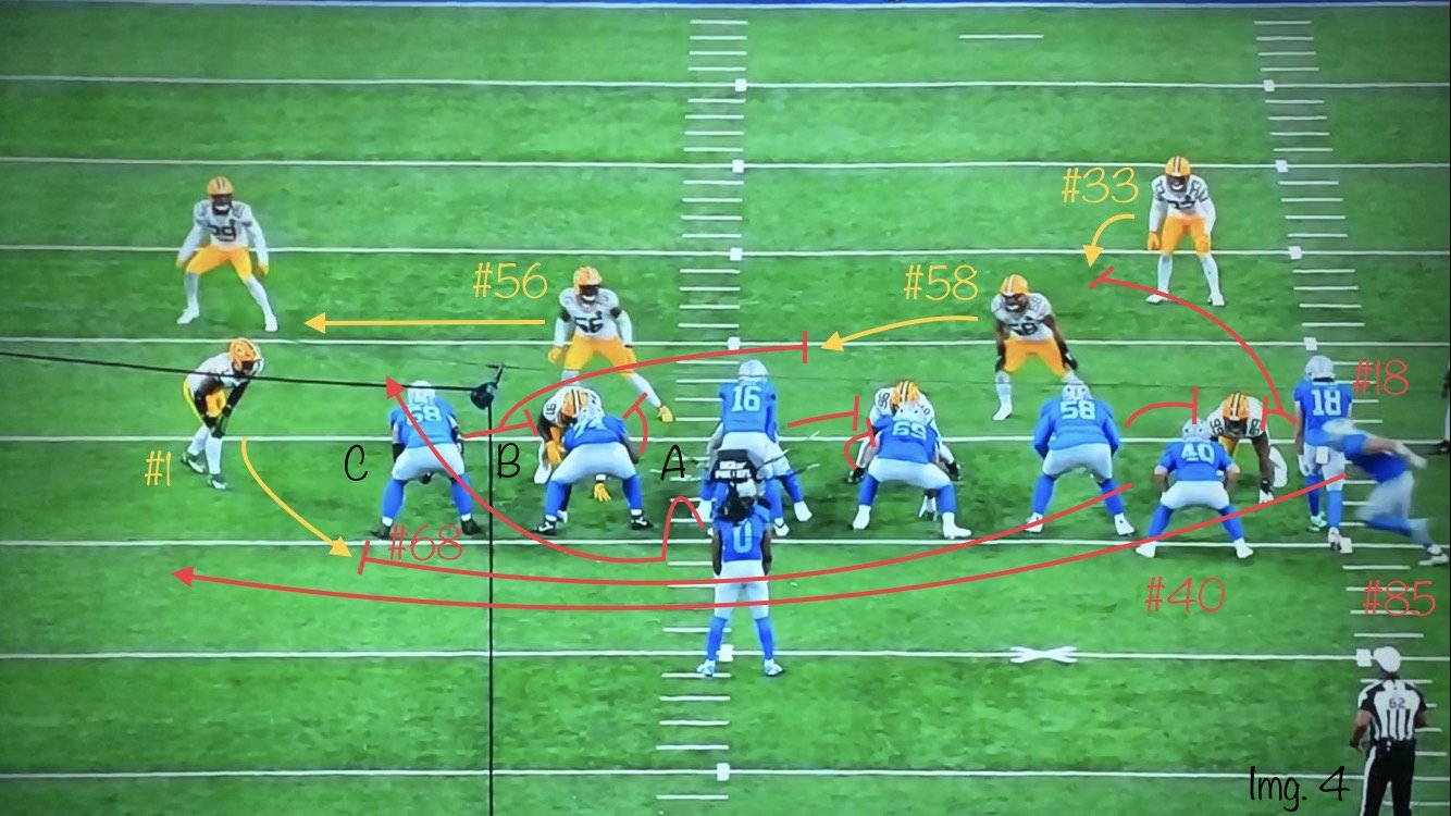 Con la chiusura, inoltre, dell’ “A-gap” per mano del “Defensive Tackle” (DT) C. Wooden (#96), Gibbs è ora costretto a correre verso l’esterno (bounce). [Immagine 3 sotto]