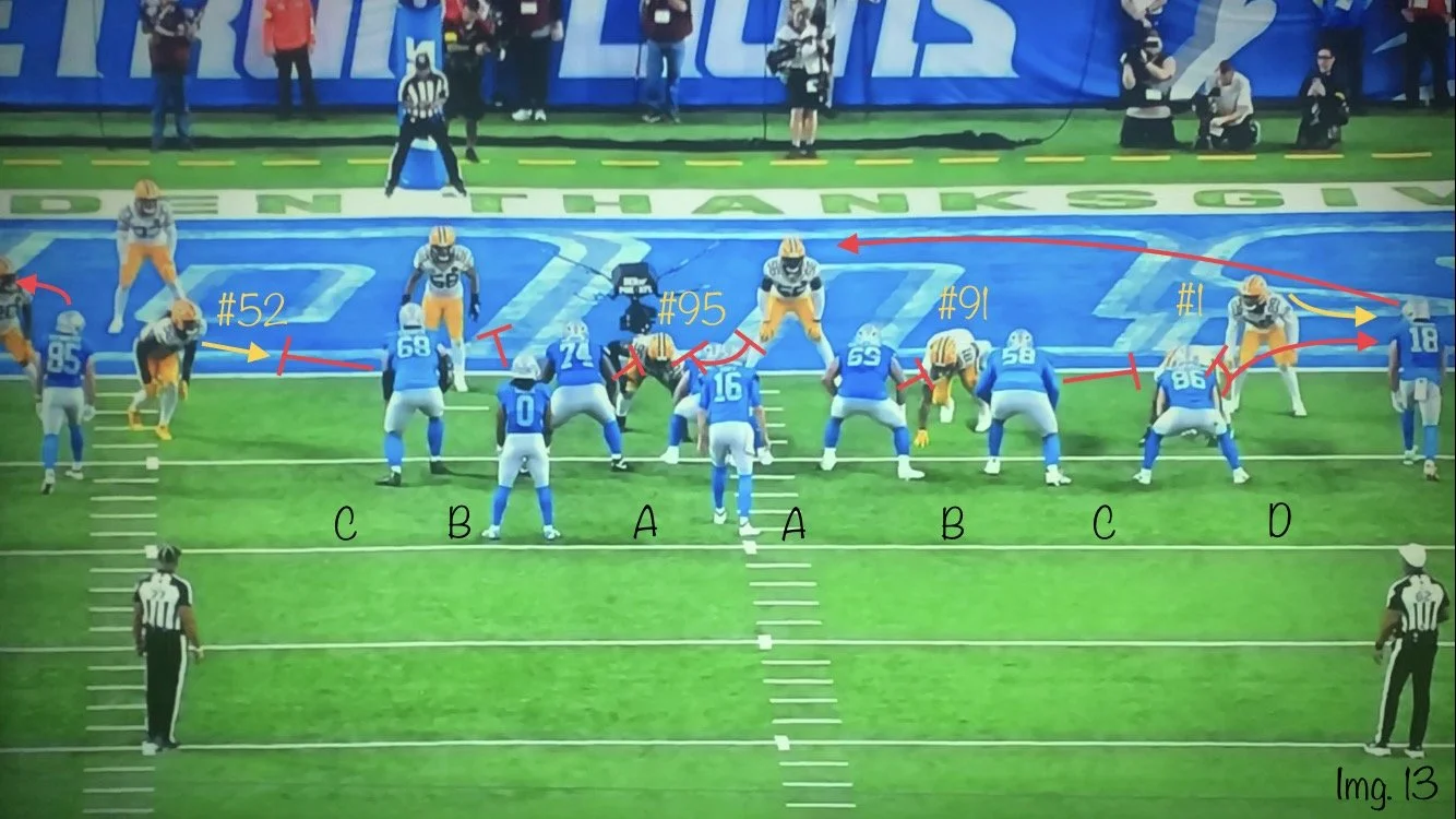 Il gioco prevede inizialmente il raddoppio su ciascun “DL” interno, per poi ristabilire l’uno contro uno grazie al passaggio di due “OL” al livello dei “LB”, mentre i “DE” sono in una situazione di “one on one” contro il “LT” (Decker) e il “TE” (Dwelley). Data la presenza di quest’ultimo, i gap da difendere diventano sette e quindi il difensore in più da coinvolgere nel “run stop” diventa la “Safety” (S) E. Williams (#33).