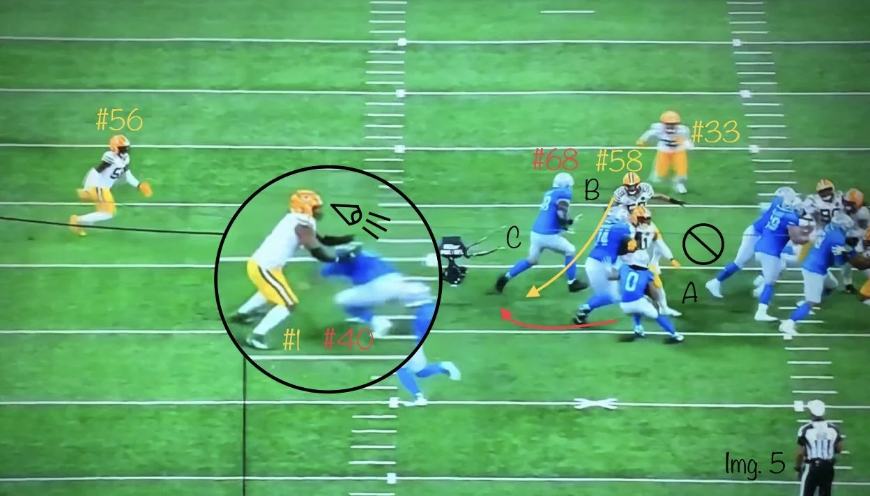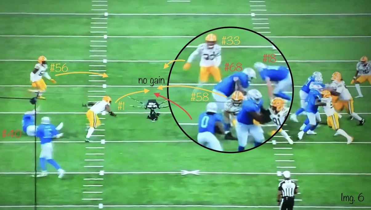 La possibilità di Gibbs di passare attraverso il “B-gap” o il “C-gap” risulterà preclusa grazie al blocco mancato nei confronti di McDuffie, il quale “sguscia” via a Decker passando per il “B-gap”, costringendo il “RB” ad allargare la sua traiettoria verso Parsons. [Immagine 5 sotto]