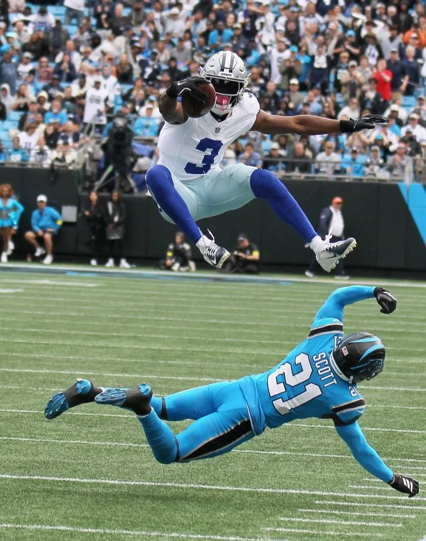 Primo quarto (min. 6:14), palla in attacco per Dallas sulle 39 yard di Carolina, Prescott lancia preciso verso George Pickens che riceve nonostante il linebacker dei Panthers in estensione abbia mancato di millimetri la deviazione del pallone. L’azione non è finita, Pickens prosegue la sua corsa e dimostra capacità olimpioniche: accelerazione e salto degli ostacoli sulla corsia laterale. La Nazionale Olimpica USA ha scoperto un nuovo specialista.